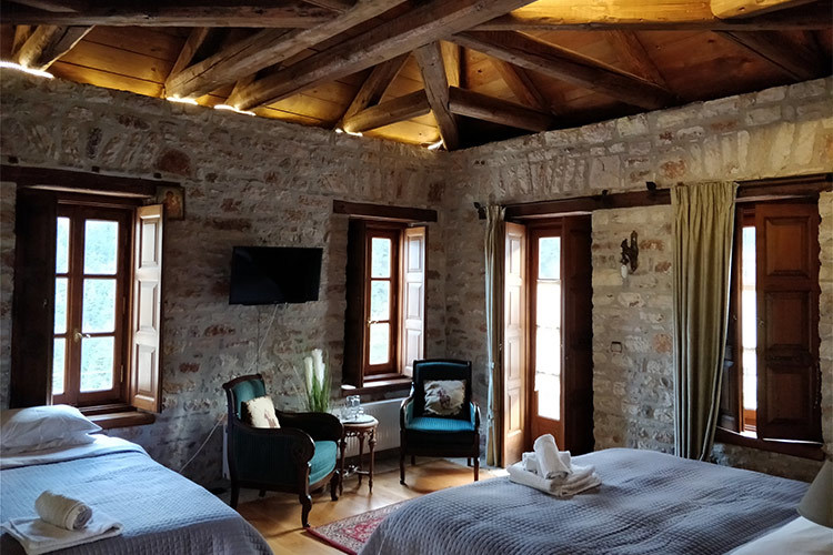 This Room’s delicate pink hues, the color of childhood and gentleness, blend with the deeper, more joyful shades of blue, to create a bright and cheerful ambience dominated by the wrought-iron king-size bed, embellished by ringlets and ample wardrobes, this room overlooks the central courtyard.